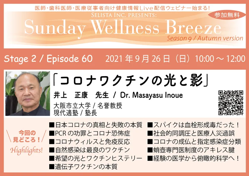 セリスタ株式会社(東京都千代田区、代表取締役:伊藤 承正)は、2021年9月26日(日)10:00~12:00に、医師・歯科医師・薬剤師・医療従事者向け無料オンラインセミナーを開催します。今回は、井上 正康 先生(大阪市立大学/名誉教授、現代適塾/塾長)に『コロナワクチンの光と影』の演題でご講演いただきます。