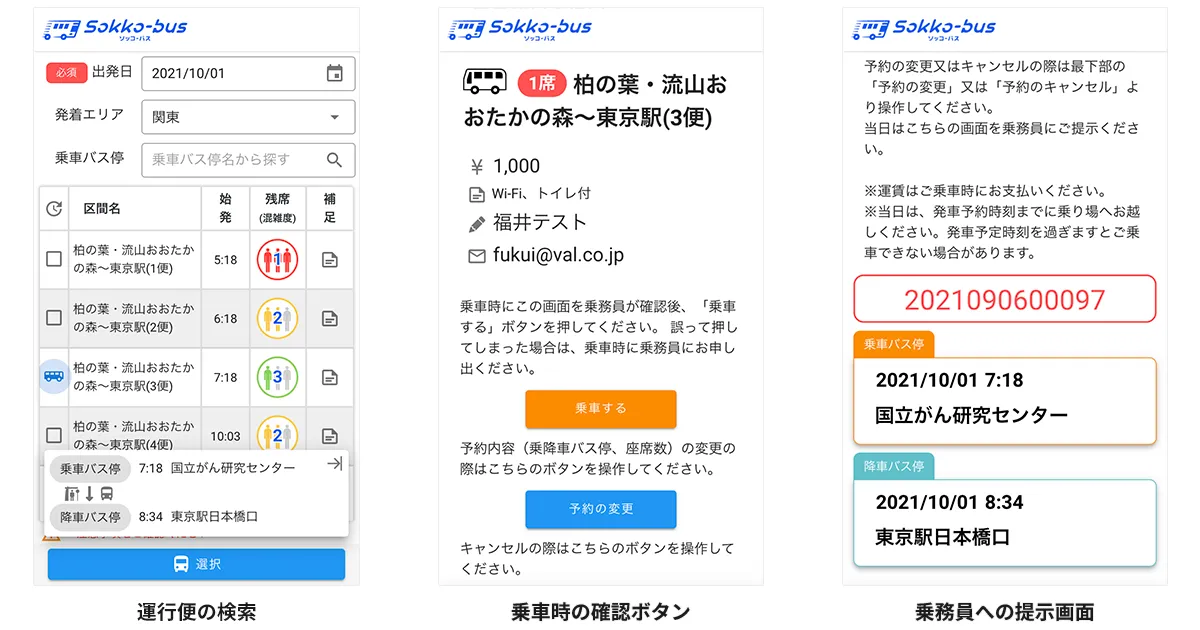 利用者はスマートフォンやパソコンのウェブブラウザから運行便の検索・予約を行い、乗車時にはスマートフォンで予約画面を提示することで、乗務員による乗車確認が行えます。