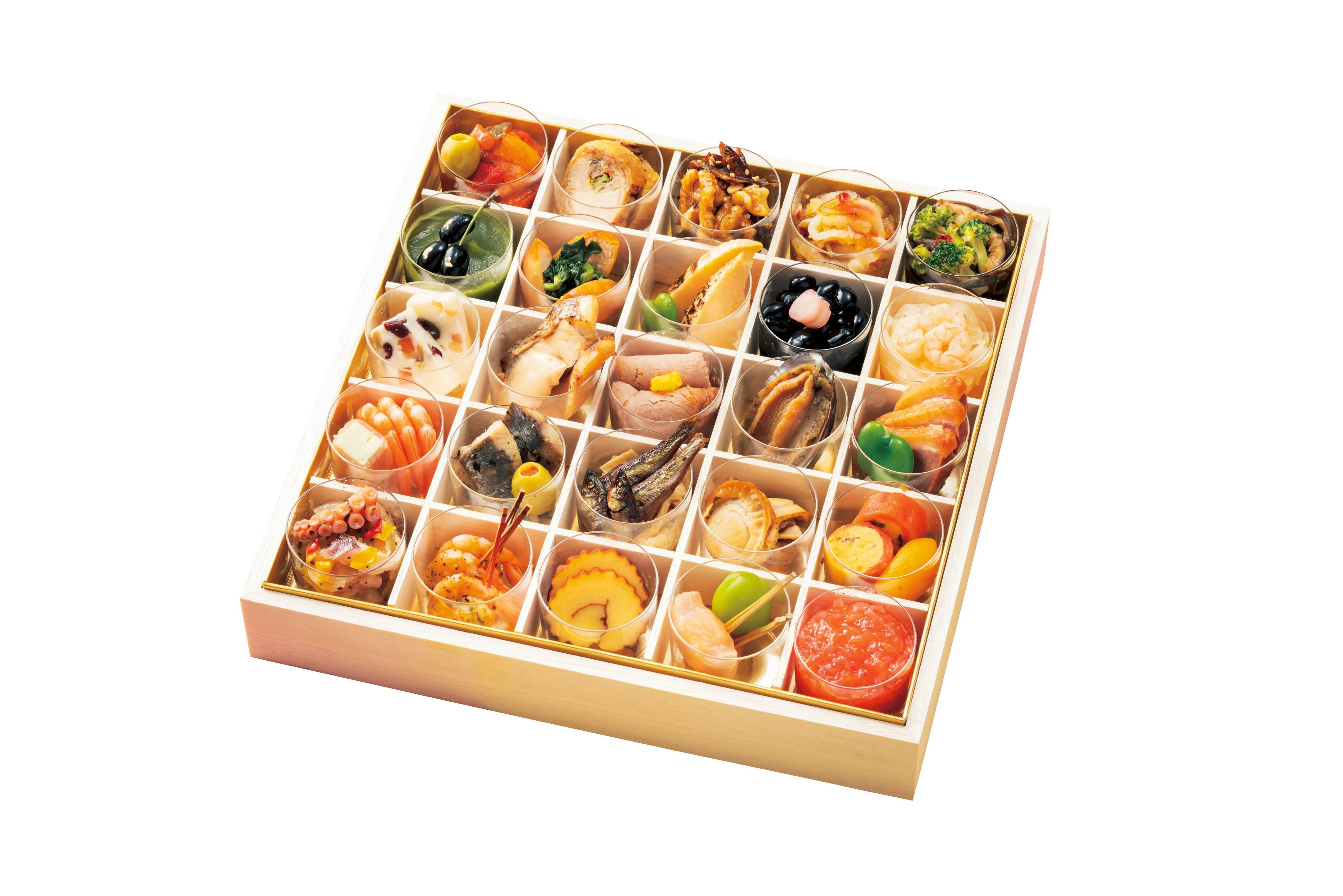監修。整然と美しく、カップに盛りつけた和洋のおせち料理は、ひとつひとつ取り出してお召し上がりいただけます。