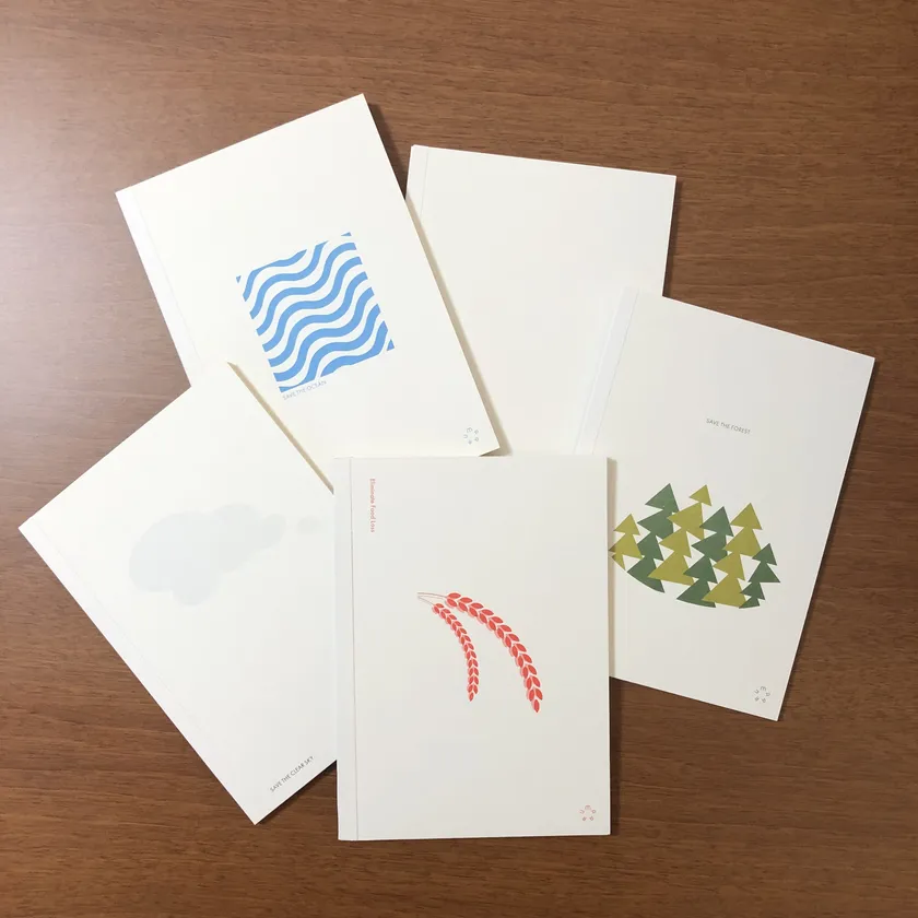 ノートの中紙に「kome-kami」を使用した、オリジナルノートを商品開発中です。当展示会では、稲穂のイラストと「Eliminate Food Loss」のメッセージなど、イラストとメッセージが入った5種類の表紙のB6サイズのノートを参考出品の予定です。