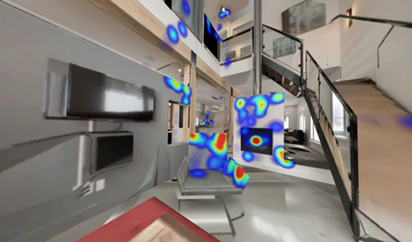 『FOVE Gaze Analyzer』はフォトグラメトリー作成ツールを展開するMetareal社のMetareal Stage(TM)にも対応します。Metareal Stage(TM)で作成された3Dバーチャルツアーを『FOVE Gaze Analyzer』を通して見ることで、3次元の空間内でユーザーが見ていた個所にヒートマップが生成されます。360度映像の実写感と、CGが持つ立体感の中間的な体験の中でユーザーの興味や関心を可視化できます。