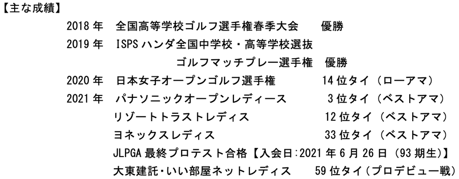 姉の明愛は、昨年の日本女子オープンでローアマチュアを獲得するなどアマチュア時代に輝かしい戦績を残し、今年のパナソニックオープンでは優勝争いの末3位フィニッシュ。ヨネックスレディスゴルフトーナメントでは、3度目の挑戦となる今年、ベストアマチュア賞に輝きました。
