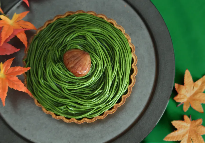 抹茶と栗の風味が調和する繊細なバランスのモンブランクリームで一面を覆いました。見た目も美しい緑色が楽しめます。