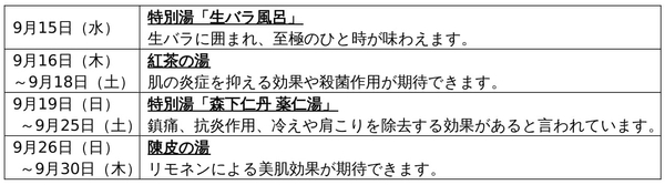9月は、年に1度の特別湯として「森下仁丹 薬仁湯」をご用意いたしました。「薬仁湯」は、温浴効果ばかりでなく、自然の恵みである薬草の持つ薬効を効率よく配合した漢方薬湯です。日頃の疲れを癒す、いろいろな薬草風呂で至福のひとときをお過ごしください。