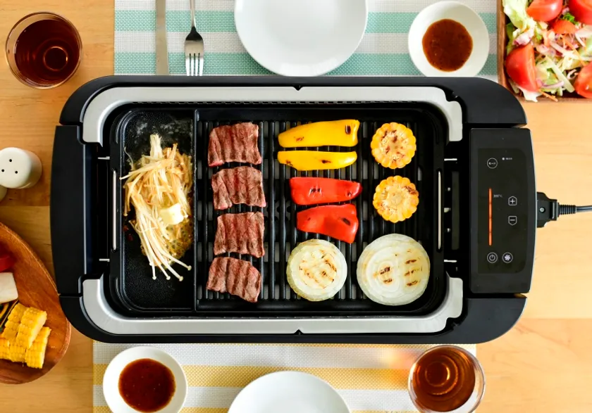 当社の「煙の少ない焼き肉グリル YGMC-FXT130」(以下、XGRILL PREMIUM)は、業界初(※1)の独自のXカット構造を採用したプレートで油落ちを促進し、さらに吸煙ファンを内蔵することで煙の拡散を抑えます。調理中の煙を約94%カット(※2)するのに加え、油ハネも軽減(※3)することができ、室内でも快適に焼き肉を楽しめる商品です。