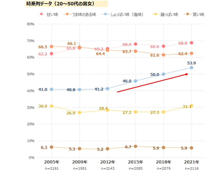 好きな味・嫌いな味・控えめにしたい味として18項目を提示したところ、地域差が最も目立ったのは「しょっぱい味(塩味)」だった。全国で5割弱が好きな味として回答しており、全国平均を大きく上回ったのは、「北海道」「東北」「首都圏」。特に「北海道」は55.6%と最も高く、一方で、「関西」「中国」「四国」は4割を下回った。20~50代の時系列を長期で見ると、多くの味が大きな変動がない中、「しょっぱい味(塩味)」は好きな味として増加を続けている。