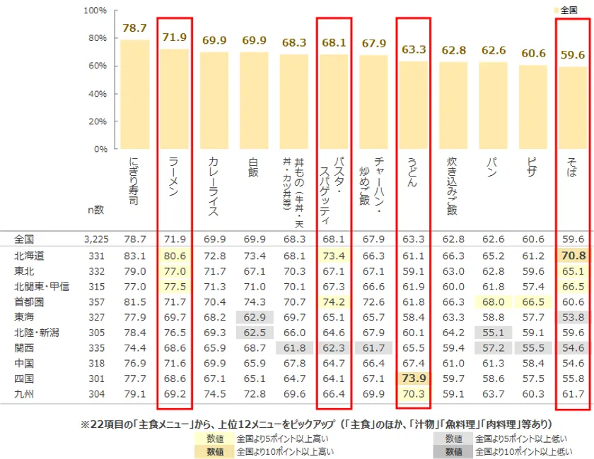 主食・汁物・肉料理・魚料理…といった食卓に登場する60種類以上のメニューの中で、地域差が目立ったメニューとして「麺類」が挙げられる。主食のメニューの全国平均として2番目に高い「ラーメン」は「北海道」「東北」「北関東・甲信」が8割前後と高く、全国平均が6割強の「うどん」は、「四国」「九州」において、7割を超えた。「パスタ・スパゲッティ」は「北海道」「首都圏」が高く、「そば」は唯一「北海道」のみ7割を超えた。