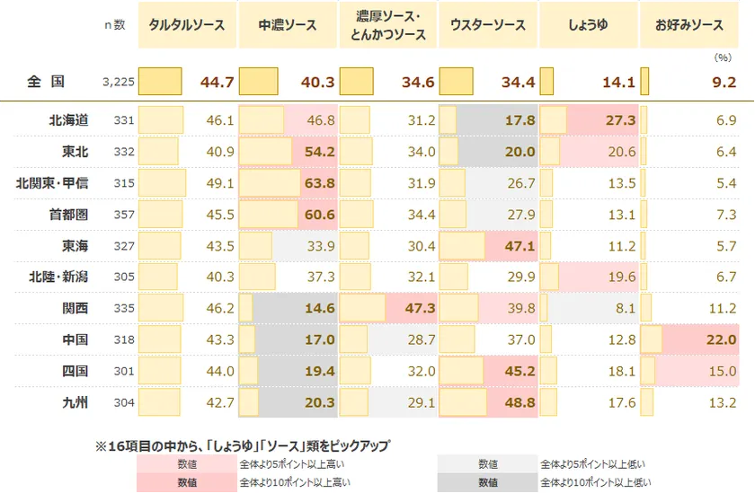 味付けの好みとして「フライ」にかける調味料を確認すると、「首都圏以北」では「中濃ソース」がよく使われている一方で、「東海」「四国」「九州」では「ウスターソース」がよく使われており、違いが顕著。その他、「関西」は「濃厚ソース・とんかつソース」が好まれ、「中国」では「お好みソース」が目立った。「北海道」は「しょうゆ」も高めと地域によって様々な嗜好がうかがえる。いずれのエリアでも同じように好まれたのは「タルタルソース」。