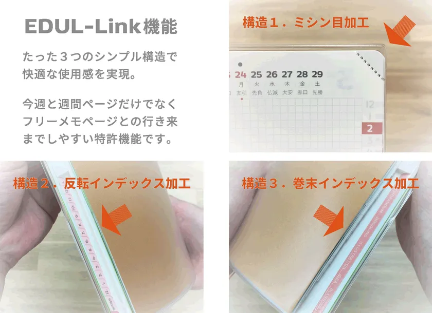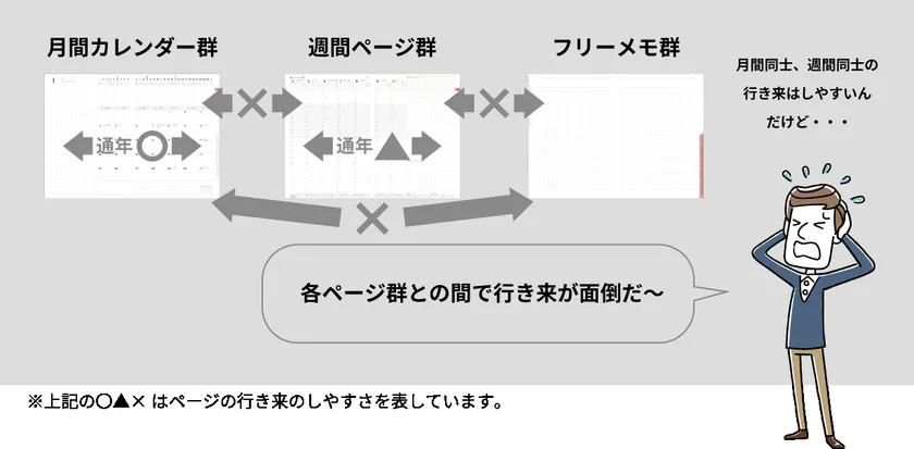 当機能は、ポピュラーなページ構成はそのまま、つまり最大のメリットを損なわずに、月間と週間の行き来をスムーズに行えるように工夫されているのですが、それを実現可能にしたのがシンプルな3つの構造です。この3つの構造だけでほぼ全てのページ移行において快適な使用感を実現しているため、手帳ユーザー様に活用方法を悩ませることなく快適にご使用いただけます。根本的な課題を解決し、さらに新たな課題を発生させない、多くの手帳ユーザー様の快適な手帳ライフを実現する構造となっています。
