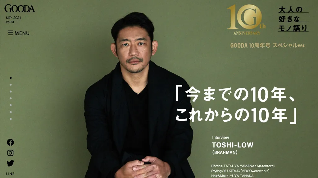 「大人の好きなモノ語り」というこの連載において異例の、「モノにこだわらないこだわり」という独自の価値観を語った、TOSHI-LOWさんが再登場。“withコロナ”2年目の今、GOODA10周年にちなんだテーマ「今までの10年、これから10年後」について聞いた。
