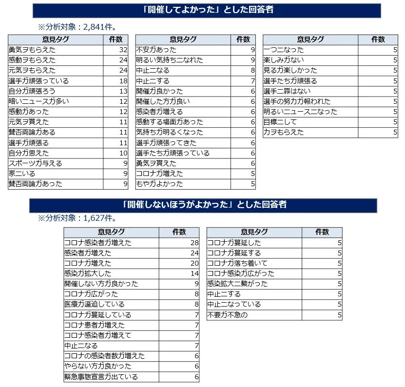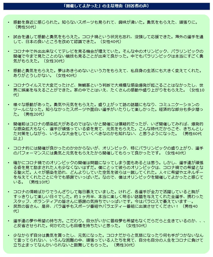 ・逆に「開催しないほうがよかった」の理由からは、「コロナ感染者が増えた」「医療が逼迫している」「緊急事態宣言が出ている」といった新型コロナウイルスの感染拡大やそれに伴う医療現場への影響を心配している内容が見られました。コロナが落ち着いてから実施してもよかったのではないか、という意見も見られました。