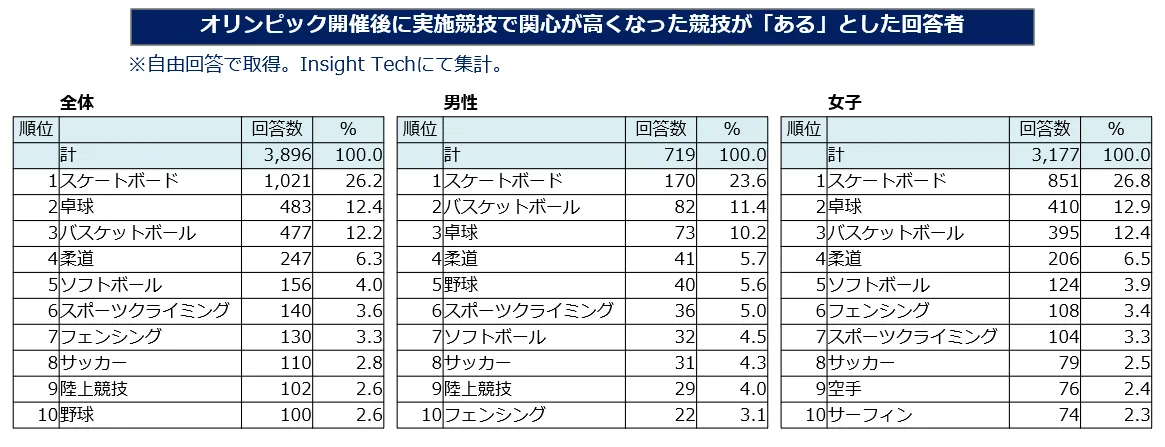 ・オリンピック開催後に実施競技で関心が高くなった競技が「ある」とした回答者に、最も関心が高くなった競技について伺うと、男女ともに1位は「スケートボード」となりました。