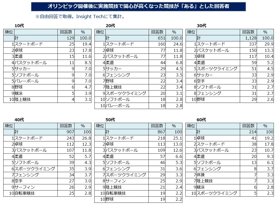 ・年代別で見ても、「スケートボード」「卓球」「バスケットボール」は上位となっています。