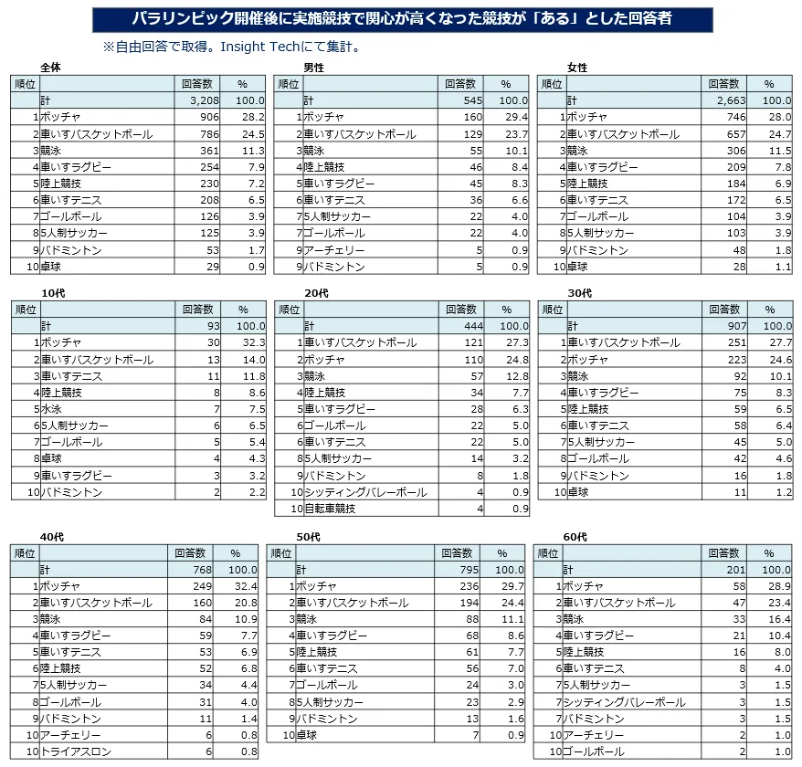 ・「ゴールボール」「5人制サッカー」など、パラリンピックのみで実施される競技も関心が高くなったことが分かりました。