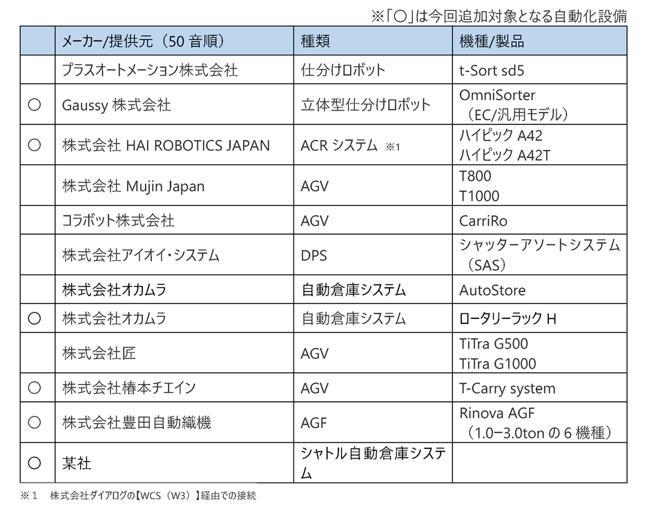 そしてこの度、今後の倉庫自動化の本格化に向け、2025年度にプラグイン強化を一気に進める決定をいたしました。第一弾として主に倉庫自動化の入口として検討される搬送、保管、仕分け工程で用いられる6機種を2025年度中に追加し、下記12機種に対応することとしました。