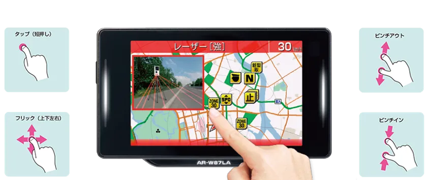スマホのようにピンチイン、ピンチアウトで地図の拡大縮小ができたり、フリックで待受画面が選択できたり、直感的な操作が可能です。