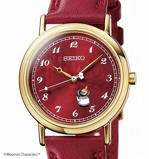 シックに艶めくルビーレッドの文字盤、やかんからひょっこり顔を出すリトルミイ。ゆったりと流れる時間を刻むお花の秒針… 。