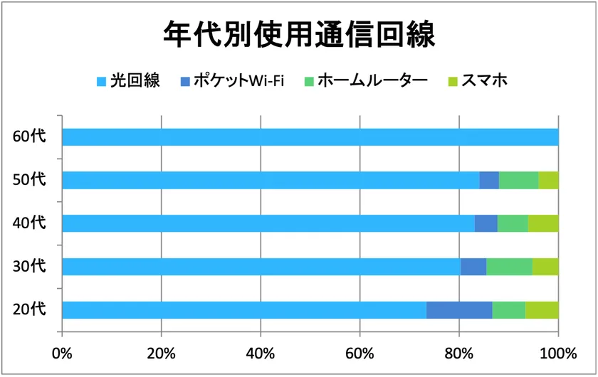 年代が上がるにつれて光回線を使用している割合が高くなっていました。