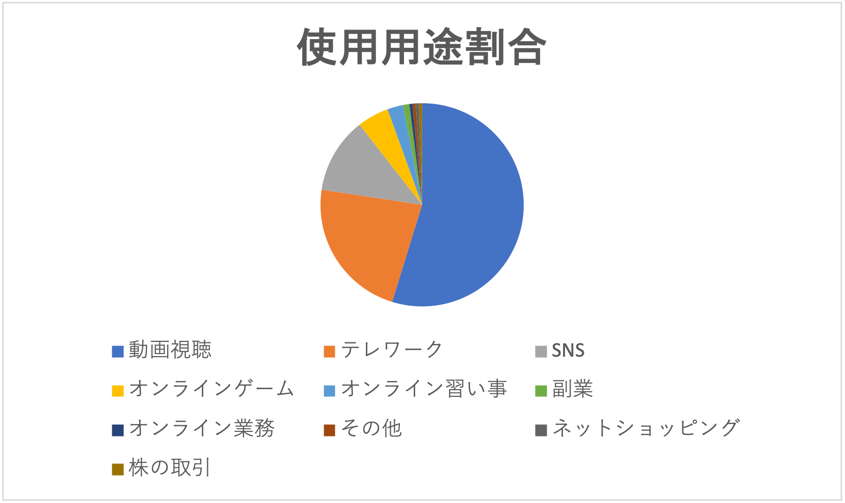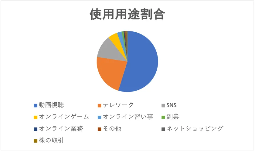 それについで、テレワークが2番目と多くやはり会社へ出勤しなくとも仕事ができるような体制が増えていることから、インターネットの使用用途の中で多かったのではないかと推測することができます。