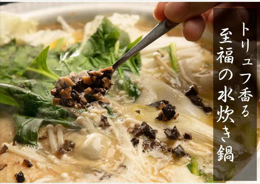 職人が長年の経験を生かし、作り上げた「フォアグラ」「トリュフ」という組み合わせで、食材で2度3度と味変を楽しむ事が出来るプレミアム水炊き鍋が誕生した。