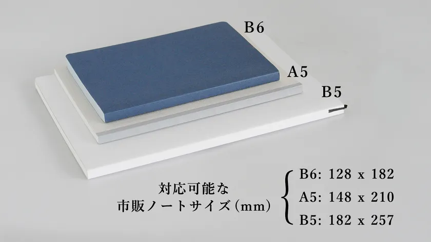 市販A5(H210×W148mm)、B5(H257mm×W182mm)、B6(H182×W128mm)サイズのノート、ダイアリー、本などが、すべて入ります。そのため、ビジネスでも、プライベートでも、自分だけの組合せの1冊ができます。