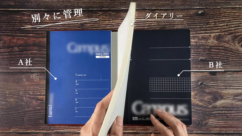 情報管理の徹底が求められている今、YOSHINA本革ノートカバーは、2冊のノートを同時に持ち歩け、次の訪問先では、異なるノートで打合せ内容を記録・管理することができます。B社訪問の際に、A社のノートは閉じたままであれば、打合せ内容を見られる心配もなくなります。