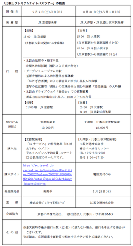 江若交通株式会社(本社:滋賀県大津市、代表取締役:安積正彦)と京都バス株式会社(本社:京都市右京区、代表取締役社長:吉本直樹)は、一般社団法人比叡山・びわ湖DMOの協力を得て、比叡山・滋賀の自然・歴史・食・文化を一日で味わうことのできる特別プラン「比叡山プレミアムナイトバスツアー ~比叡山・滋賀の自然・歴史・食・文化に触れる特別な一日~」を開催します。