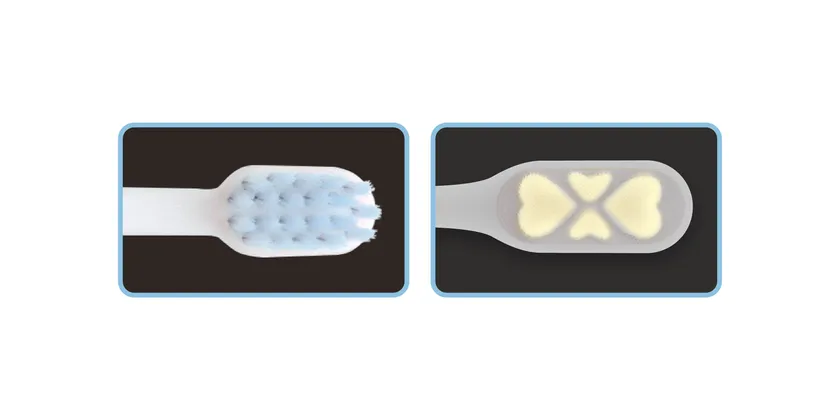 小さなヘッドなので、お子様のお口の中で動かしやすいです。ハート形の植毛は、歯にくぼみの部分が当たることで、歯の隙間までしっかり磨け、汚れを落としやすい構造になっています。また、ブラシの毛は柔らかいだけでなく先端が細くしなやかに曲がるので、小さな歯の隙間に入り歯垢をやさしく掻き出します。