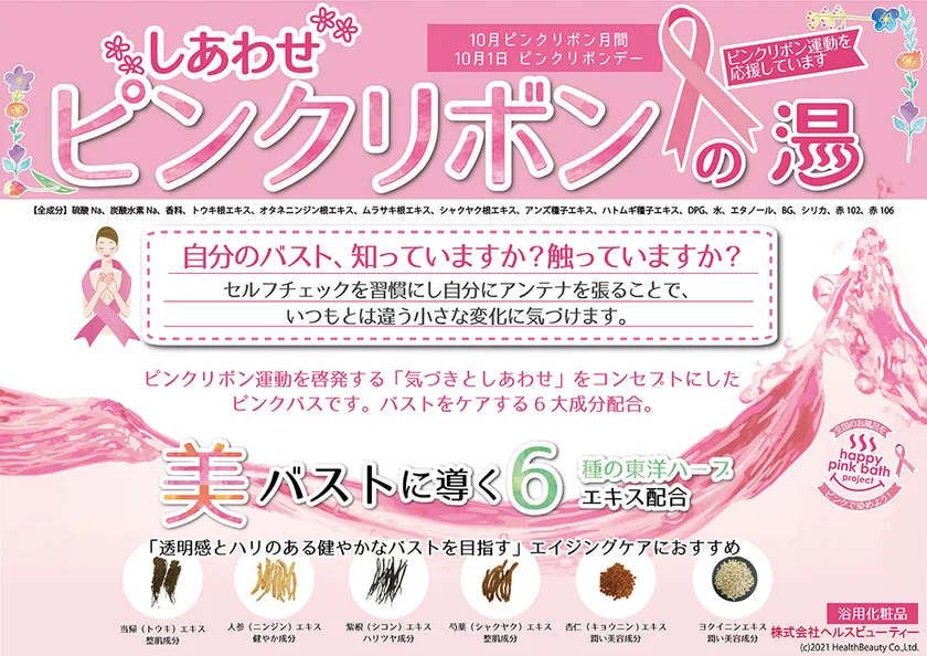 株式会社極楽湯(本社:東京都千代田区、代表取締役社長:新川 隆丈)は、ピンクリボン月間にあわせて行われる「日本列島しあわせピンクバスプロジェクト」への参加が決定しました。2021年10月1日(金)~10月31日(日)の期間中、直営28店舗にて順次、お風呂イベント「しあわせピンクリボンの湯」を開催します。