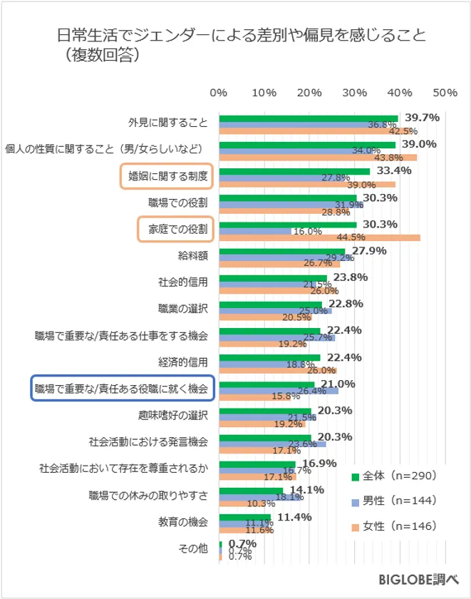 さらに、日常生活でジェンダーによる差別や偏見を感じることがあると回答した20代から60代の男女290人に「日常生活でジェンダーによる差別や偏見を感じること」を質問したところ、「外見に関すること」(39.7%)「個人の性質に関すること(男らしい/女らしいなど)」(39%)、「婚姻に関する制度」(33.4%)、「職場での役割」(30.3%)、「家庭での役割」(30.3%)が3割をこえる結果に。