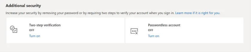 次に、自身のMicrosoftアカウント( https://account.microsoft.com/account/Account?ru=https%3A%2F%2Faccount.microsoft.com%2F&destrt=home-index )にアクセスし、「高度なセキュリティオプション」を選択します。「追加のセキュリティオプション」の中に、「パスワードレスアカウント」があります。これをオンにしてください。
