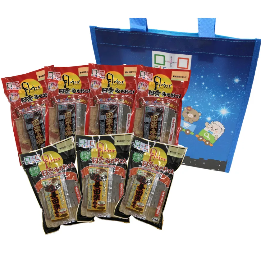 温めるだけで食べられる田楽みそ付き串こんにゃく秘伝田楽みそ、生姜田楽みその2種類を、こんにゃくパークオリジナルエコバッグに入れ、お得な950円(税込)で販売します。