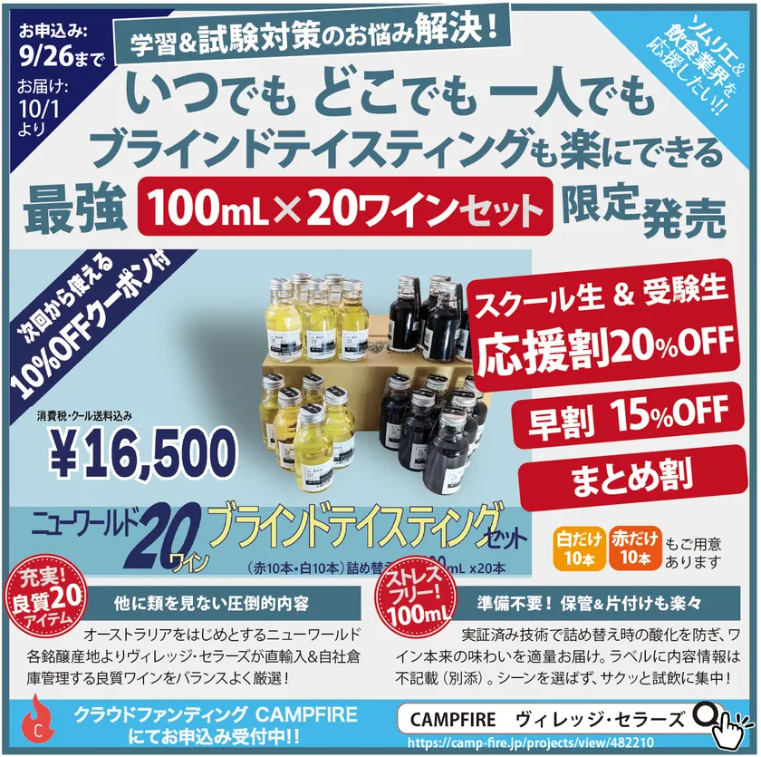 【最強のワイン資格試験対策】 これまでにない充実ブラインドテイスティングができる 100mL×ニューワールド20ワインセットを クラウドファンディングで9月13日より限定販売開始