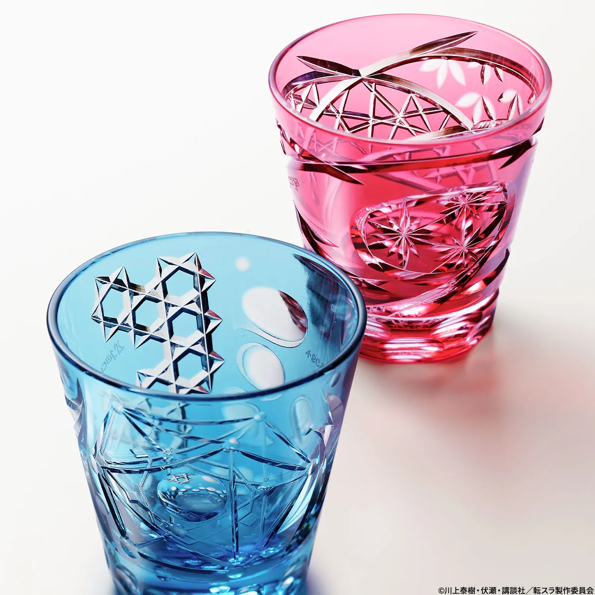 ジュラ・テンペスト連邦国で客人のおもてなしに使われていたカットグラスに、江戸切子職人のスキルが加わり、眩い煌めきを放つ切子グラスに進化!リムルとミリム、2種類の江戸切子グラスが誕生しました。