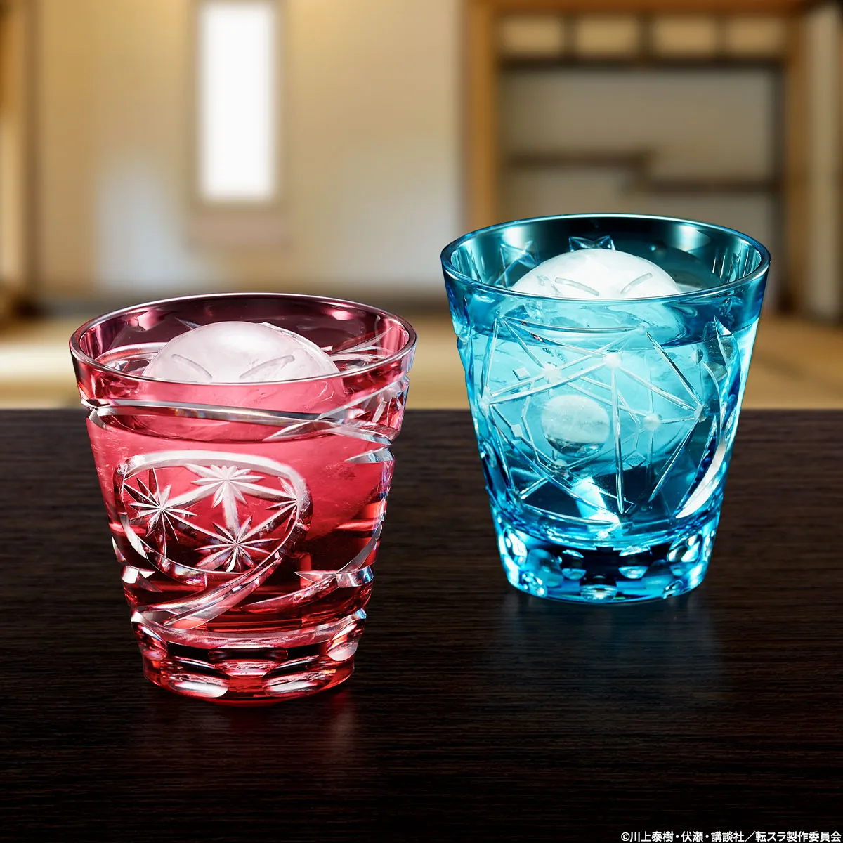 リムルをイメージした空色の切子グラスと、天真爛漫なミリムをイメージした紅色の切子グラス。