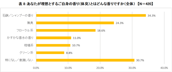 このほか「ご自身の理想の香り」の質問では、「石鹸・シャンプーの香り」(34.3%)を支持する人がトップ。自然で控えめなにおいが求められています。