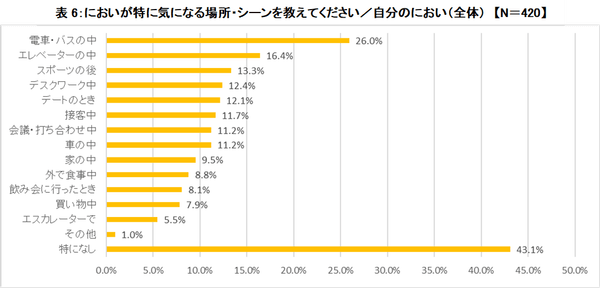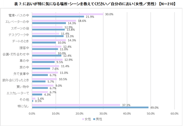 自分のにおいが気になる場所・シーンについて聞きました。「電車・バスの中」(26.0%)、「エレベーターの中」(16.4%)といった人の密集度が高い場所が上位になっています。次いで女性は「デートのとき」(14.3%)が3位。ちょっぴり女心がうかがえる結果に。男性は「スポーツの後」(13.8%)が3位で、汗のにおいが気になるようです。