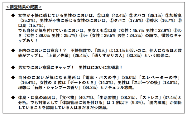 ◆女性が不快に感じている男性のにおいは、①口臭(42.4%)②タバコ(38.1%)③加齢臭(35.2%)。男性が不快に感じる女性のにおいは、①タバコ(17.6%)②香水(16.7%)③口臭(15.7%)。
