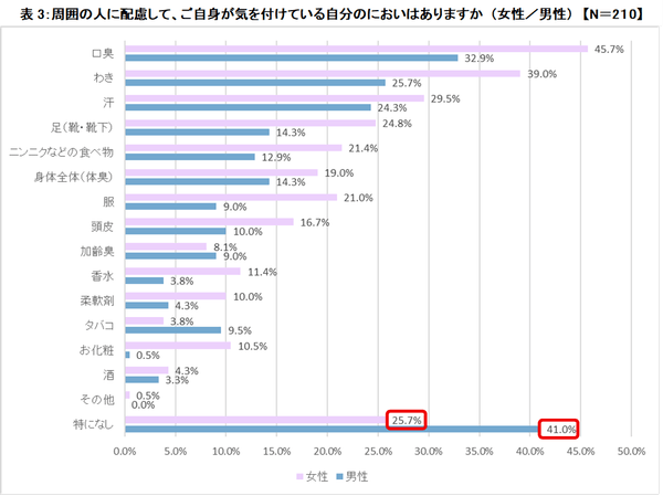 男女ともに周囲に配慮して自分自身で気を付けているにおいは、①口臭(女性:45.7% 男性:32.9%)②わき(女性:39.0% 男性:25.7%)③汗(女性:29.5% 男性:24.3%)。