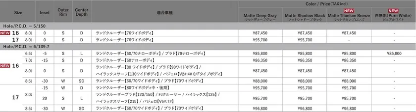追加カラーはマットチタンブロンズと白無垢(ピュアホワイト)の2カラーとなり、マットチタンブロンズは16インチの発売と同時に17インチのラインアップにも追加します。白無垢(ピュアホワイト)は16インチの中でもワンサイズのみのラインアップ(16×6.5J 6H139.7 inset-5)となり、特にランドクルーザー40,60,70,系のファンが好むカラーです。