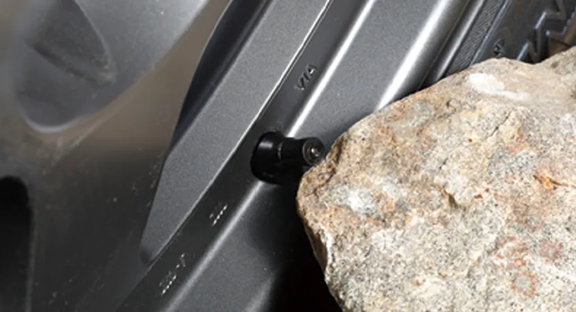 岩石登坂路などにおいては、エアバルブが岩と接触するケースもあり、スチールやアルミバルブでは破損し走行に支障をきたすケースがある為、あえてショートタイプのゴムバルブを標準装備。