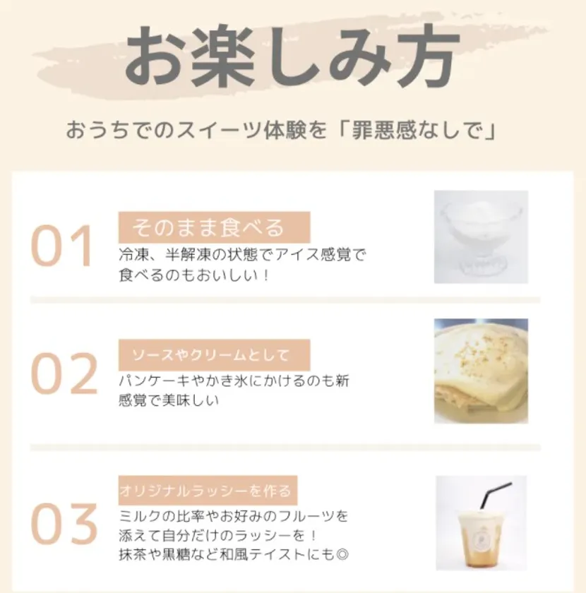 冷凍・半解凍でアイス感覚で食べるのも良いですし、パンケーキやかき氷にソースとしてかける・ミルクの比率を変える・お好みのフルーツを添えて自分だけのラッシーを作るのも良いですし、和風テイストにも合います。