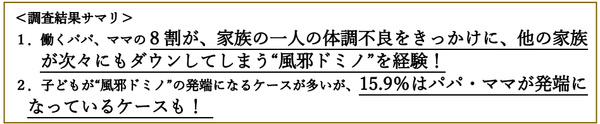 1.働くパパ・ママの8割が、家族一人の体調不良をきっかけに、他の家族が次々とダウンしてしまう“風邪ドミノ”を経験!