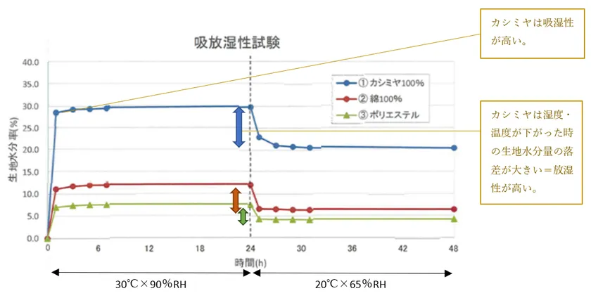 カシミヤは綿・ポリエステルに比べ調湿性(吸放湿性=生地が湿気を吸ったり吐いたりする性質)に優れているため、肌周りの湿度を快適な状態に保ちます。