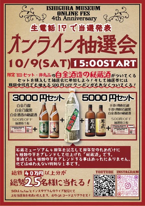 白金酒造【公式】インスタグラム&白金酒造【公式】YouTubeにてLIVE配信中に特賞・1等~5等を配信中に当選者を発表。当選者には生電話にて当選をお知らせいたします。6等~は石蔵ミュージアムHPにて当選番号を発表