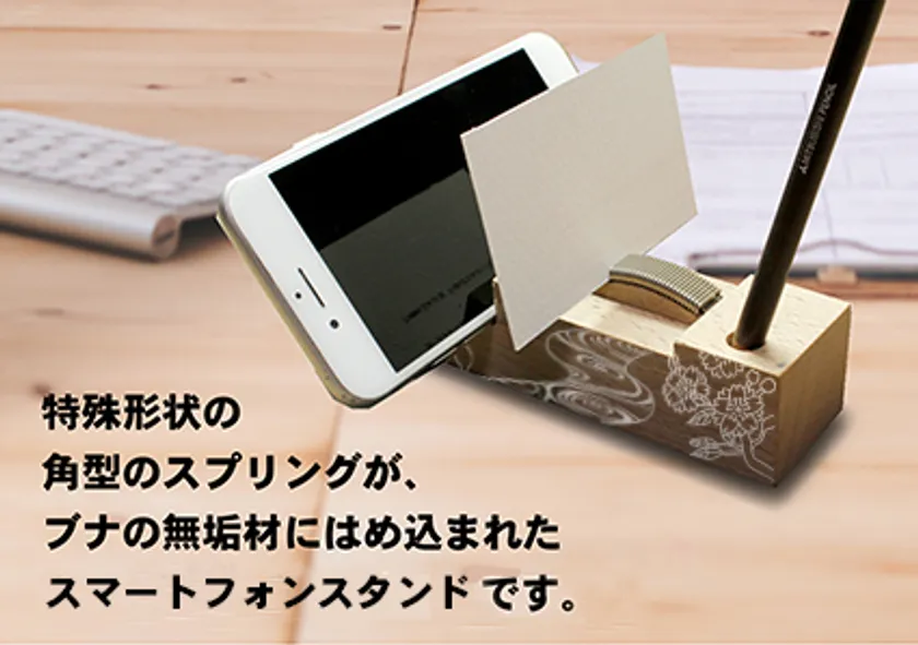 当サイトで取り扱う製品の1つであるスマホスタンドは、1台で4つの役割を果たします。スマホスタンドとしてZoomでのWEB会議やテレビ電話の際に役立つ他に、金属部分はカードホルダーとして、木材の丸い穴はペン立てとして使えます。木材部分は約120gの重みがある良質なブナの無垢材で、ペーパーウエイトとしても利用でき、デスクの上から紙が飛ぶのを防ぎます。幅広い世代の方に受け入れられるシンプルかつ気品のあるデザインです。