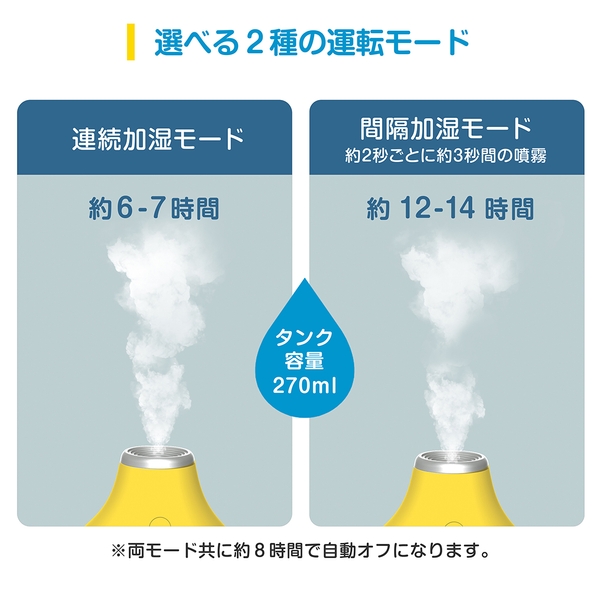 連続加湿モードと約2秒ごとに約3秒間噴霧する間隔加湿モードを搭載しているため、お部屋の状態や好みに合わせて加湿ができます。