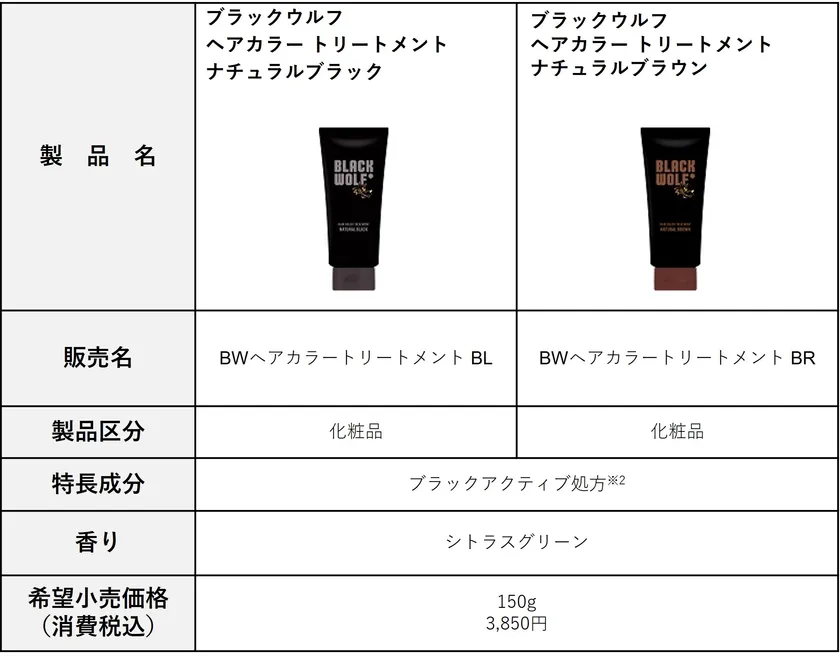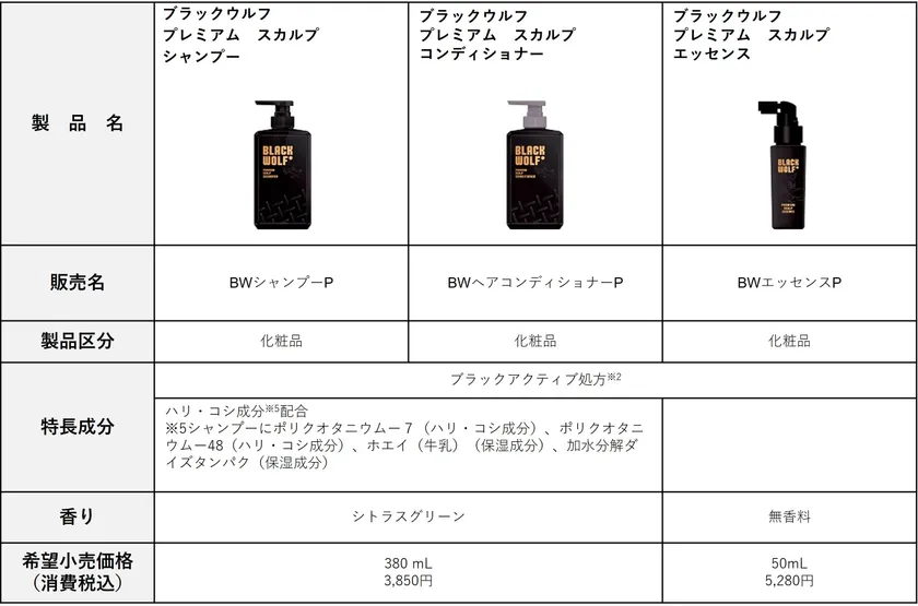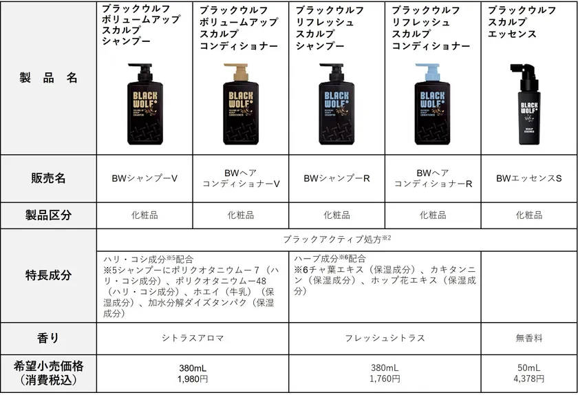 「ブラックウルフ」は、自分本来の頭皮の活力※1に着目し、ブラックアクティブ処方※2を採用した、『黒髪をケアするためのヘアケアブランド』です。濃密泡で頭皮アブラを落とすシャンプー、黒髪にハリ・コシを与えるコンディショナー、頭皮に潤いを与えるスカルプエッセンスの3アイテムを取り揃えたシリーズで頭皮環境をサポートします。お好みの仕上がりタイプに合わせて選べる“ボリュームアップライン”“リフレッシュライン”“プレミアムライン”の3タイプからなるシャンプーとコンディショナーに加え、スカルプエッセンスや2タイプのカラートリートメントといったラインアップで、ブラックウルフブランドを展開してまいります。