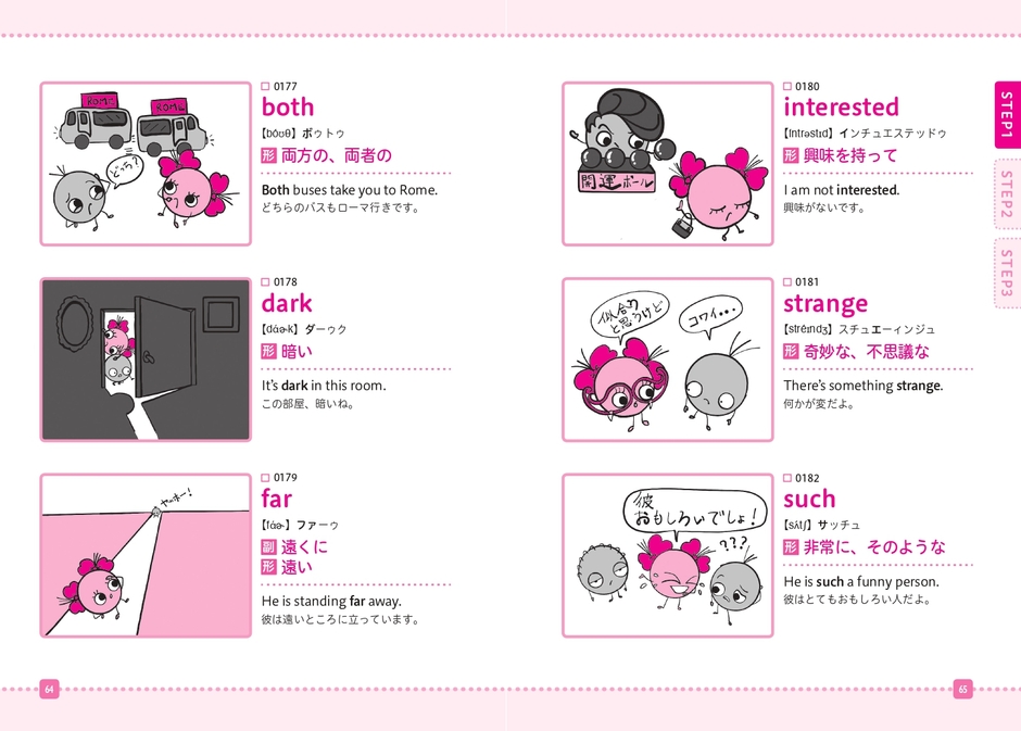 すべての単語に1コマ漫画が描きおろされていて、クスっと笑いながら英単語を学べる1冊です。