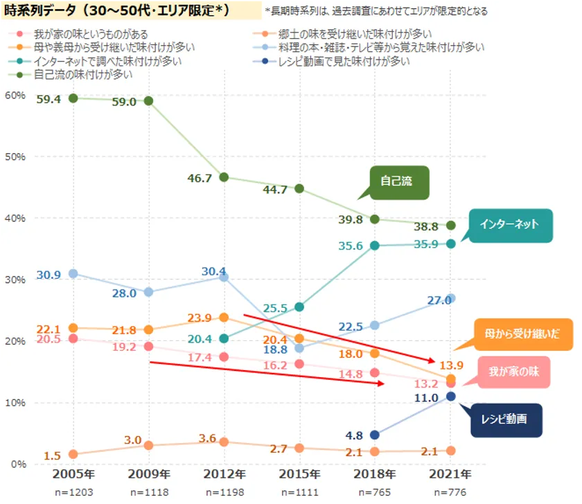 「我が家の味」「母から受け継いだ味付け」は減少傾向、 一方で「インターネット」「レシピ動画」からの味付けが増加 最新レポート「味の地域差に関する調査2021《料理編》」を発表